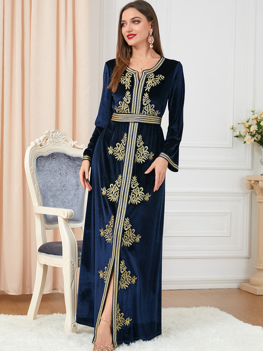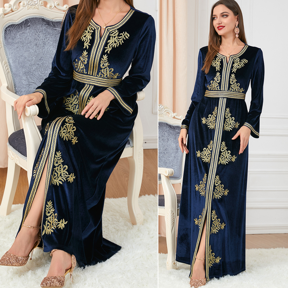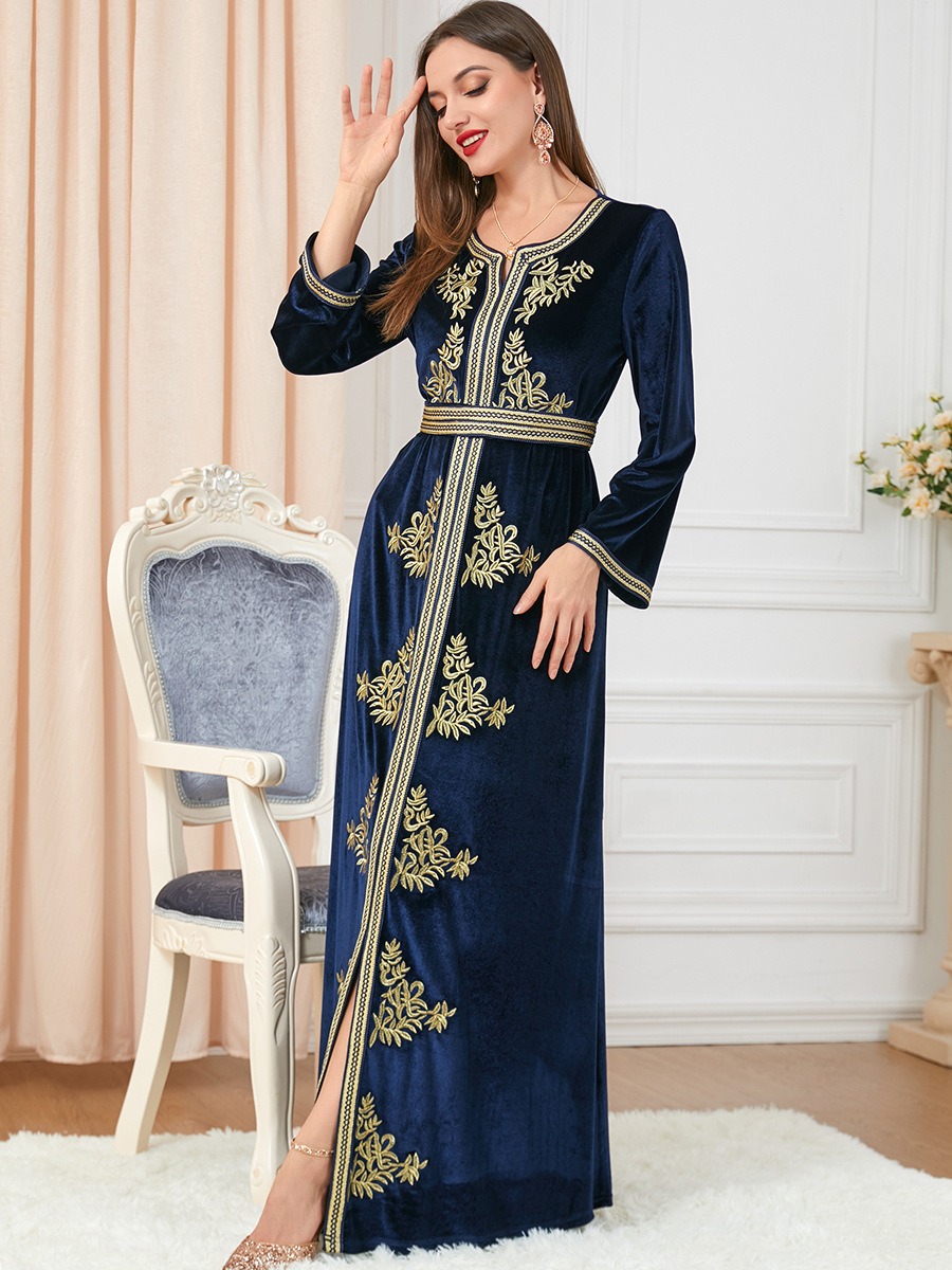 New Arrival Long-sleeved Slit Autumn And Winter Women's Wear Embroidered Clothes Velvet Dress